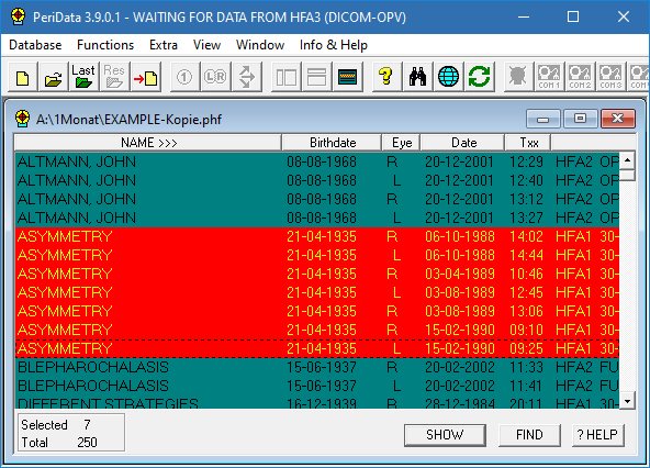 - Open a visual field database (menu Database > Open) >> The database window with the examination list appears.