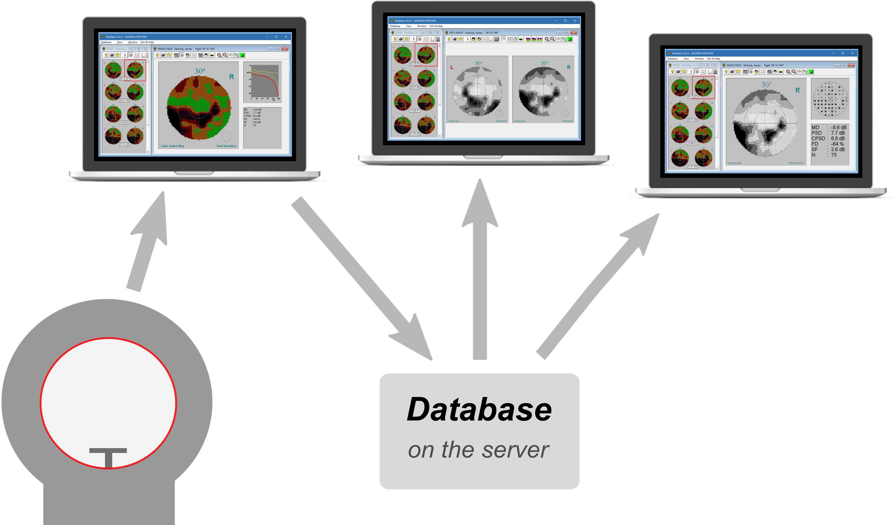 At the end of a visual field examination, most perimeters send the data automatically when the SAVE button is pressed. Some perimeters require a mouse click. The transmission takes 1 - 3 seconds. PeriData